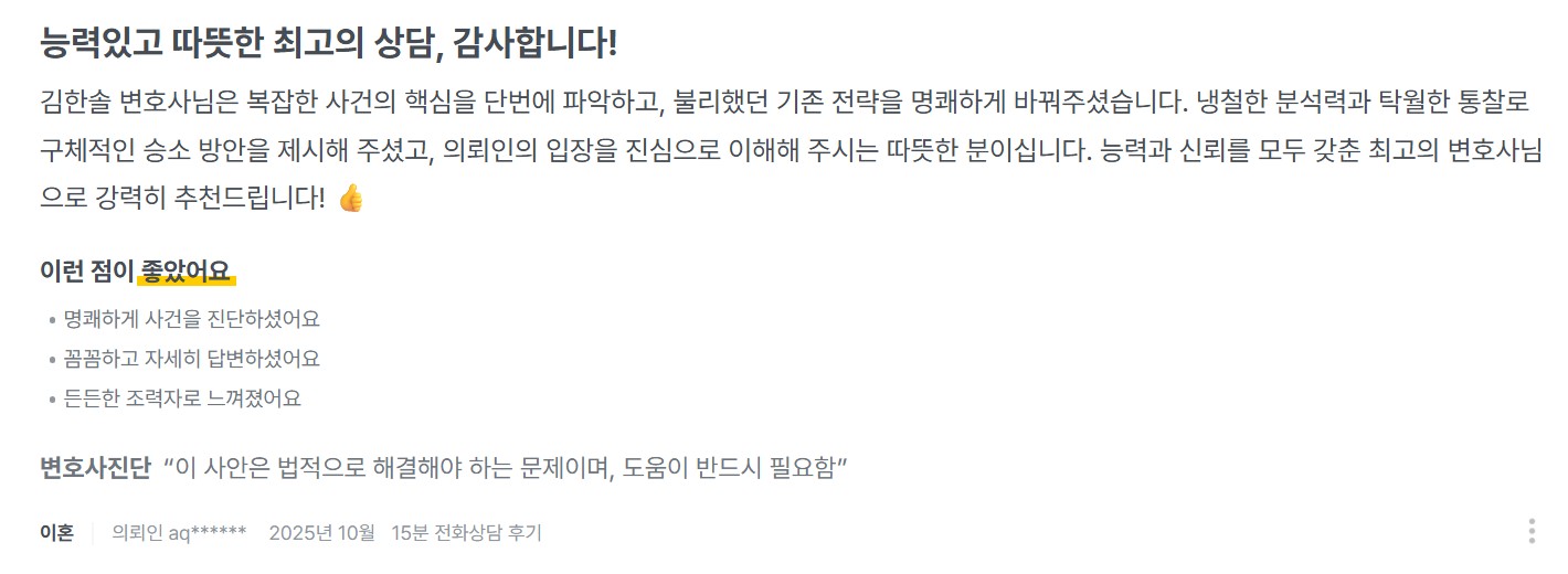 ±èÇÑ¼Ö º¯È£»ç´ÔÀº º¹ÀâÇÑ »ç°ÇÀÇ ÇÙ½ÉÀ» ´Ü¹ø¿¡ ÆÄ¾ÇÇϰí, ºÒ¸®Çß´ø ±âÁ¸ Àü·«À» ¸íÄèÇÏ°Ô ¹Ù²ãÁּ̽À´Ï´Ù. ³ÃöÇÑ ºÐ¼®·Â°ú Ź¿ùÇÑ ÅëÂû·Î ±¸Ã¼ÀûÀÎ ½Â¼Ò ¹æ¾ÈÀ» Á¦½ÃÇØ Áּ̰í, ÀÇ·ÚÀÎÀÇ ÀÔÀåÀ» Áø½ÉÀ¸·Î ÀÌÇØÇØ Áֽô µû¶æÇÑ ºÐÀ̽ʴϴÙ. ´É·Â°ú ½Å·Ú¸¦ ¸ðµÎ °®Ãá ÃÖ°íÀÇ º¯È£»ç´ÔÀ¸·Î °·ÂÈ÷ Ãßõµå¸³´Ï´Ù! 👍