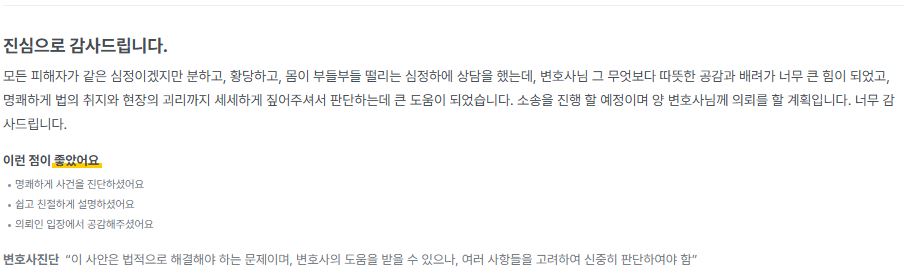 ¸ðµç ÇÇÇØÀÚ°¡ °°Àº ½ÉÁ¤À̰ÚÁö¸¸ ºÐÇϰí, Ȳ´çÇϰí, ¸öÀÌ ºÎµéºÎµé ¶³¸®´Â ½ÉÁ¤ÇÏ¿¡ »ó´ãÀ» Çߴµ¥, º¯È£»ç´Ô ±× ¹«¾ùº¸´Ù µû¶æÇÑ °ø°¨°ú ¹è·Á°¡ ³Ê¹« Å« ÈûÀÌ µÇ¾ú°í, ¸íÄèÇÏ°Ô ¹ýÀÇ ÃëÁö¿Í ÇöÀåÀÇ ±«¸®±îÁö ¼¼¼¼ÇÏ°Ô Â¤¾îÁּż ÆÇ´ÜÇϴµ¥ Å« µµ¿òÀÌ µÇ¾ú½À´Ï´Ù. ¼Ò¼ÛÀ» ÁøÇà ÇÒ ¿¹Á¤ÀÌ¸ç ¾ç º¯È£»ç´Ô²² ÀÇ·Ú¸¦ ÇÒ °èȹÀÔ´Ï´Ù. ³Ê¹« °¨»çµå¸³´Ï´Ù.